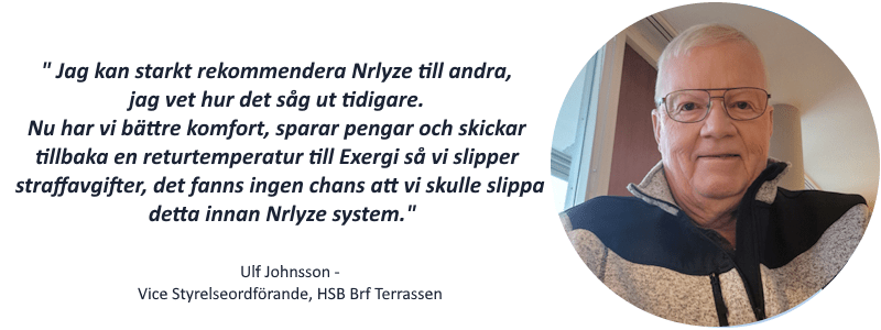 ” Jag kan starkt rekommendera Nrlyze till andra, jag vet hur det såg ut tidigare. Nu har vi bättre komfort, sparar pengar och skickar tillbaka en returtemperatur till Exergi så vi slipper straffavgifter, det fanns ingen chans att vi skulle slippa detta innan Nrlyze system” säger Ulf Johnsson, Vice Styrelseordförande Brf terrassen.